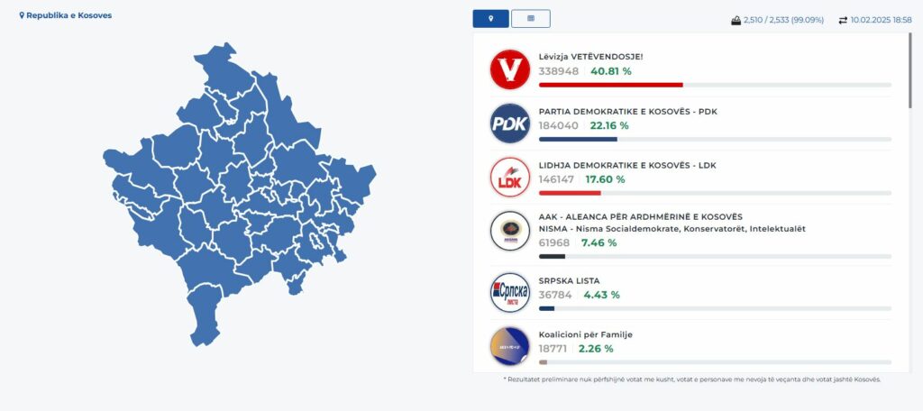 Me tashmë 99.09% të votave të numëruara, LVV ka 40.81% të votave, e ndjekur nga PDK me 22.16%.
