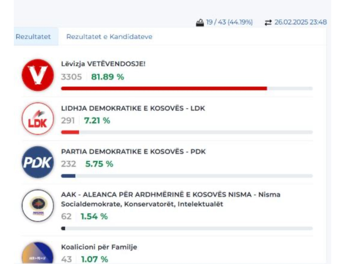 Sipas të dhënave të publikuara nga KQZ në orën 23:48, deri më tani janë numëruar 44.19% e kutive të votimit. Nga rezultatet e deritanishme, Lëvizja Vetëvendosje kryeson me 81.89% të votave, e ndjekur nga LDK me 7.21%, PDK me 5.75%, AAK-Nisma me 1.54% dhe Koalicioni për Familjen me 1.07%.