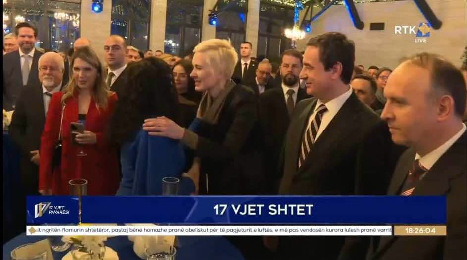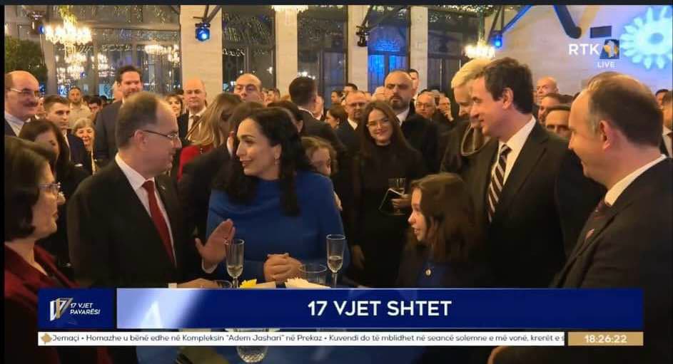 Në një tavolinë të përbashkët po qëndrojnë presidentja Osmani e kryeministri Kurti me rastin e pritjes shtetërore për 17-vjetorin e Pavarësisë së Kosovës.