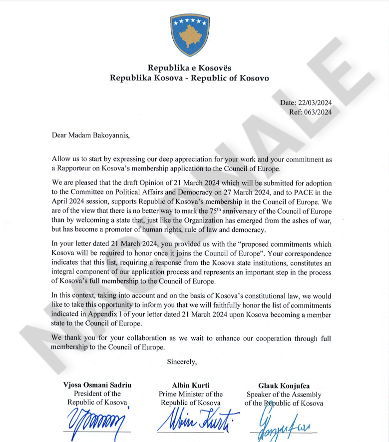 Presidentja Vjosa Osmani, kryeparlamentari Glauk Konjufa dhe kryeministri Albin Kurti i kanë dërguar një letër raportueses për Kosovën në Këshillin e Evropës, Dora Bakojanis, ku janë zotuar se do t`i zbatojnë të gjitha masat që i kërkohen Kosovës pasi të bëhet pjesë e Këshillit të Evropës.