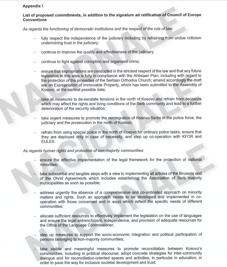 Në shtojcën, e cila i është bashkangjitur letrës, listohet propozimet për çka Kosova zotohet se do t`i përmbushë pas anëtaresimit në Këshill të Evropës.