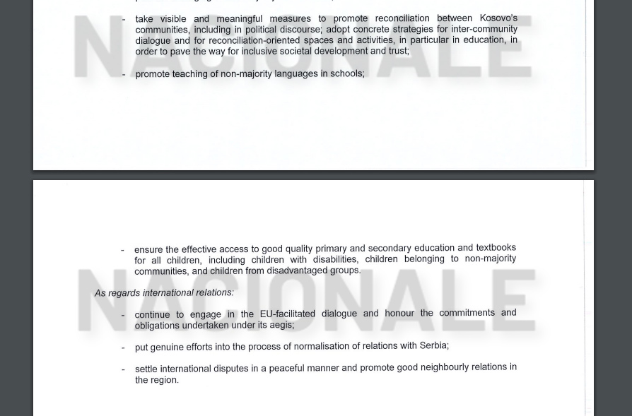“Të ndajmë burime të mjaftueshme për ta zbatuar në mënyrë efikase legjislacionin për përdorimin e gjuhëve dhe t’i sigurojmë rrënjosjen ligjore, pavarësinë dhe ofrimin e burimeve adekuate për Zyrën e Komisionarit të Gjuhëve; T’i shtojmë masat për t’i mbështetur integrimin socio-ekonomik dhe pjesëmarrjen politike të personave që u përkasin komuniteteve jo-shumicë; Të ndërmarrim masa të dukshme dhe domethënëse për ta promovuar pajtimin mes komuniteteve të Kosovës, përfshirë diskursin politik; të zbatojmë strategji konkrete për dialog mes komuniteteve dhe për hapësira e aktivitete të orientuara nga pajtimi, sidomos në arsim, me qëllim që të hapet rruga për zhvillim gjithëpërfshirës shoqëror e besim; Ta promovojmë mësimdhënien e gjuhëve jo-shumicë në shkolla; Ta sigurojmë qasjen efikase në shkollim dhe tekste të cilësisë së mirë në shkollimin fillor dhe të mesëm për të gjithë fëmijët, përfshirë fëmijët me aftësi të kufizuara, fëmijët që u përkasin komuniteteve jo-shumicë dhe fëmijët nga grupet e pavaforizuara” është thënë në shtojcë.