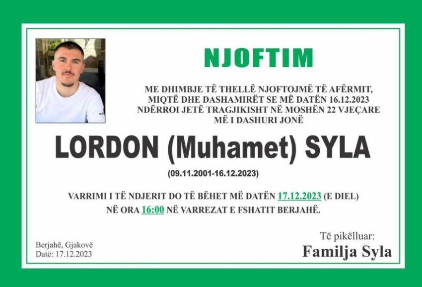 Lajme Sot i jepet lamtumira e fundit 22-vjeçarit qĂ« u godit pĂ«r vdekje mbrĂ«mĂ« nĂ« Prizren đ 17.12.2023 đ 0