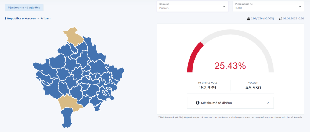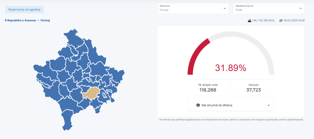 Pas Prishtinës ku votuan gati 80 mijë persona, komunat me daljen më të madhe deri në 15:00 janë Prizreni me 45 mijë e 530 qytetarë që kanë shfrytëzuar të drejtën e votës dhe Ferizaj me 31.89% dalje, ose 37 mijë e 723.
