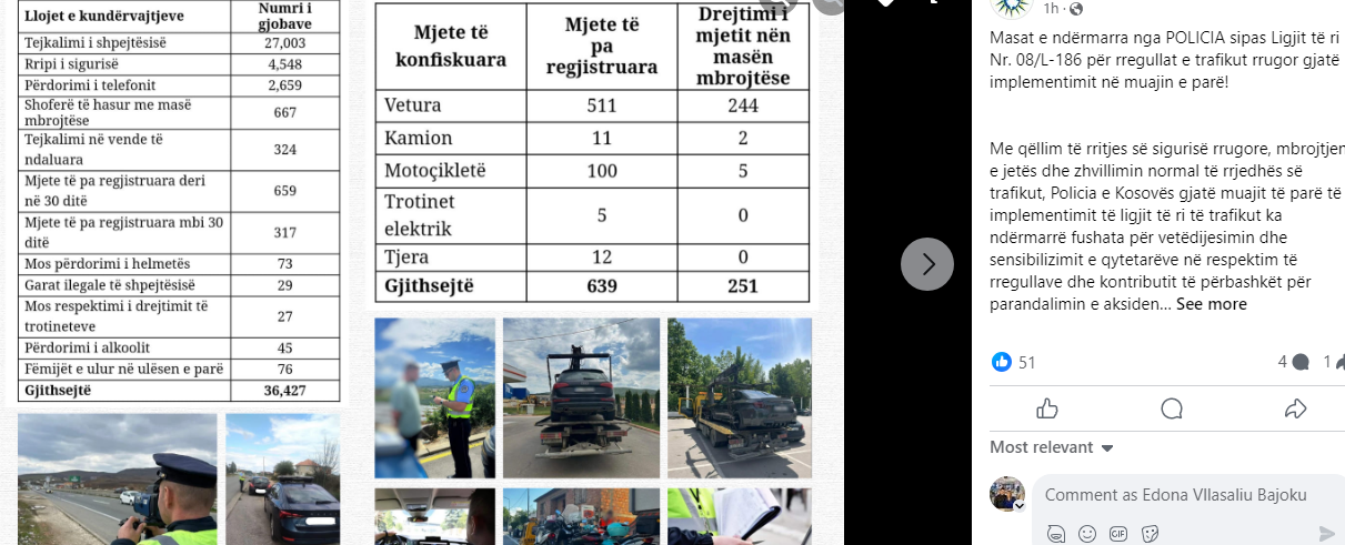 Sipas një njoftimi nga Policia bëhet e ditur se 27,003 gjoba janë shqiptuar për tejkalim të shpejtësisë dhe 4,548 për rrip të sigurisë.