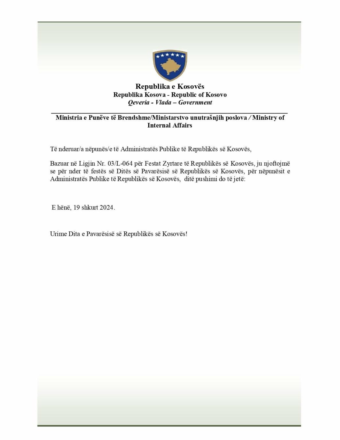 “Bazuar në Ligjin Nr. 03/L-064 për Festat Zyrtare të Republikës së Kosovës, ju njoftojmë se për nder të festës së Ditës së Pavarësisë së Republikës së Kosovës, për nëpunësit e Administratës Publike të Republikës së Kosovës, ditë pushimi do të jetë: e hënë, 19 shkurt 2024”, thuhet në njoftim.