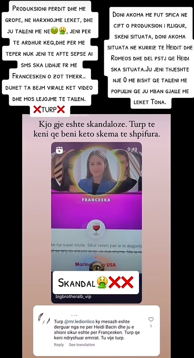 “Turp ky mesazh është dërguar nga ne për Heidi Bacin dhe ju e shisni sikur është për Françeskën.Turp që keni ndryshuar emrat.T’iu vijë turp.”-ka shkruar fansja.