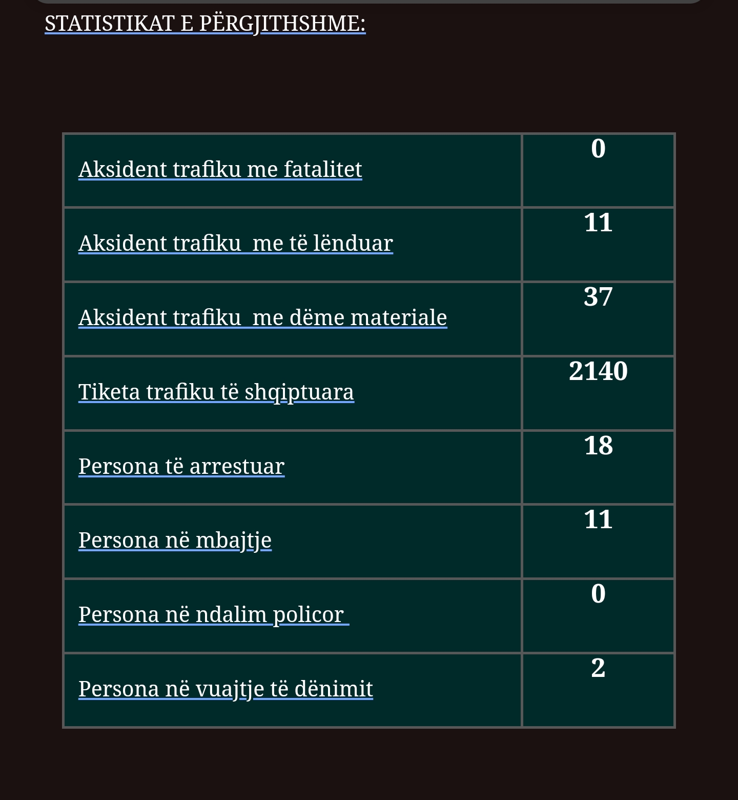 Sipas policisë, gjatë 24 orëve të fundit janë evidentuar disa aksidente në trafikun rrugor, ku 11 kanë qenë me lëndime, ndërsa 37 me dëme materiale.