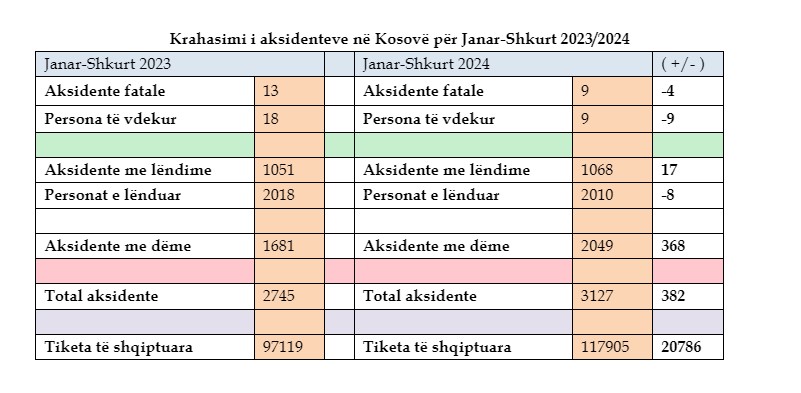 3127 aksidente trafiku kanë ndodhur gjatë muajit janar dhe shkurt të vitit 2024 ka deklaruar Policia e Kosovës.
