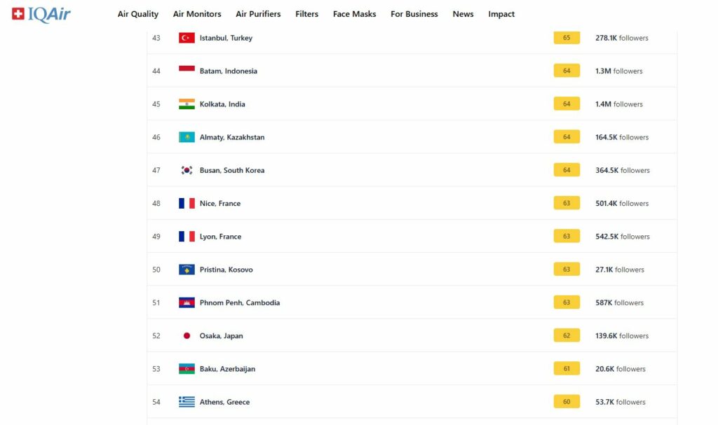 Sipas të dhënave të platformës “IQ Air”, Prishtina renditet e 50-ta në botë.