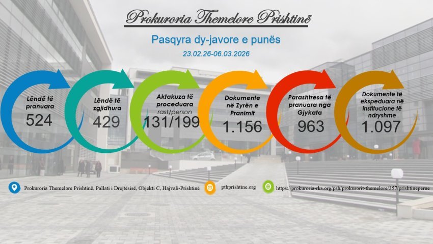 Prokuroria Themelore në Prishtinë, gjatë periudhës dyjavore nga data 23.02.2026 deri më datë 06.03.2026, ka realizuar një angazhim të vazhdueshëm në trajtimin e lëndëve penale.