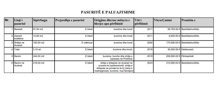 Ndërkaq, në emër të bashkëshortit Prindon Sadriut ajo ka deklaruar një banesë në vlerë mbi 59 mijë 760 euro, një shtëpi në Australi 170 mijë euro, një garazh kolektive 6 mijë euro.
