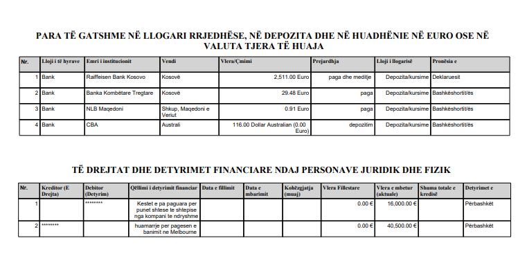 Po ashtu aty u deklaruan edhe paga e bashkëshortit si të hyra vjetore me 11 mijë e 68 euro dhe nga qiratë në Australi me 12 mijë e 500 euro.