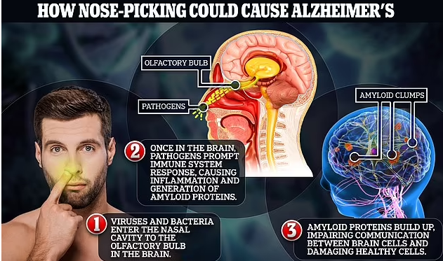 Teoria mbizotëruese është se patogjenët në gishta transferohen në zgavrën e hundës, nga ku mund të udhëtojnë në tru, duke shkaktuar inflamacion. Inflamacioni kronik dihet se dëmton qelizat e trurit, gjë që përfundimisht mund të çojë në rënien kognitive karakteristike të sëmundjes së Alzheimerit. Për më tepër, pastrimi i shpeshtë i hundës mund të dëmtojë mukozën e hundës, duke e bërë më të lehtë për mikroorganizmat e dëmshëm që të hyjnë në qarkullimin e gjakut, të shkaktojnë infeksione dhe të shkaktojnë inflamacion të mëtejshëm.