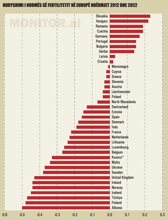 Të dhëna të krahasueshme të Eurostat tregojnë se Shqipëria ka parë rënien më të madhe të fertilitetit nga viti 2021 deri në vitin 2022. Të dhënat zyrtare nga Eurostat tregojnë se norma e lindshmërisë në Shqipëri ishte 1.71 fëmijë për grua më 2012 dhe në vitin 2023 zbriti në 1,21 fëmijë për grua.
