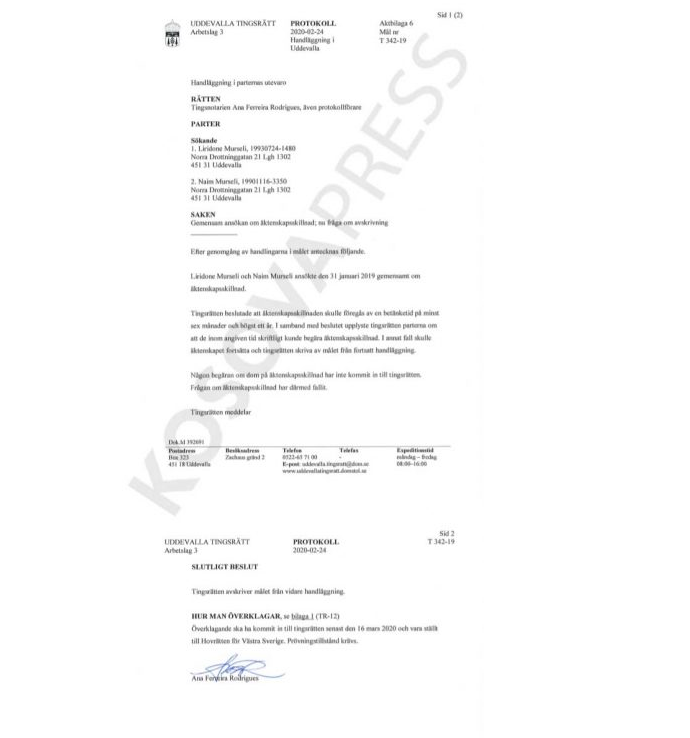 Për këtë, Gjykata e Qarkut të qytetit Uddevalla më 24 shkurt të vitit 2020 kishte marrë vendim për të ndërprerë çështjen nga procedimi i mëtejshëm.