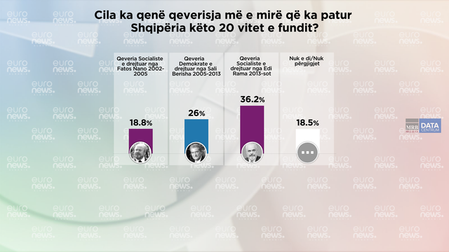 Nga përgjigjjet e qytetarëve duket qartë se qeverisja më e mirë sipas tyre eshte ajo e Edi Ramës me 36% të të pyeturve qe e kanë zgjedhur, pas tij vjen qeverisja e Berishës me 26% që mendojnë se ka qenë qeverisja më e mirë dhe më pas ajo e Fatos Nanos me 18.8%.