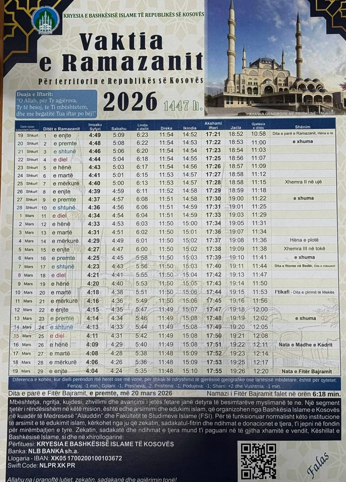 Vaktia e Ramazanit përfshin oraret e sakta të syfyrit, iftarit dhe namazeve dhe shërben si udhërrëfyes ditor për besimtarët në Kosovë gjatë gjithë muajit të agjërimit.