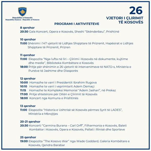 Qeveria e Kosovës ka publikuar agjendën e aktiviteteve për shënimin e 26-vjetorit të Çlirimit të Kosovës.
