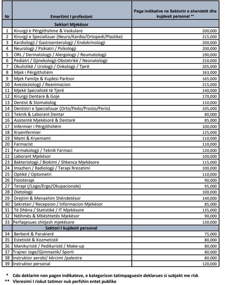 Lista, e cila do të shërbejë si një instrument referues për analizën e riskut, me qëllim identifikimin e rasteve të mundshme të mosdeklarimit të pagave reale të punonjësve, luhatet në intervalin nga 75 mijë lekë për pagat e berberëve dhe parrukierëve deri në 215 mijë lekë për kirurgët.