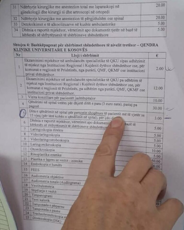 Sipas një vendimi, saktësisht pika 5 e shtojcës 4 – përcaktohet se dita e qëndrimit në spital për personin shoqërues të pacientit më të vjetër se 15 vjec kushton 3 euro