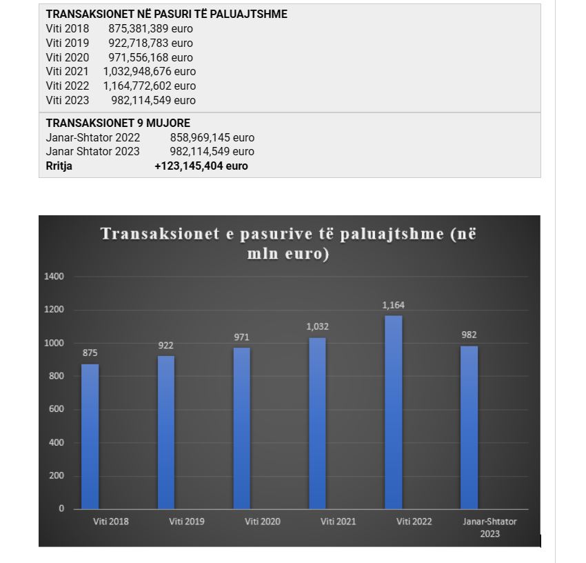 Përgjatë 9 muajve të këtij viti transaksionet në sektorin e pasurive të paluajtshme kanë kapur vlerën rekord prej 982,1 milionë euro. Krahasuar me një vit më parë, vlera e transaksioneve në këtë sektor është rritur me më shumë se 123 milionë euro.
