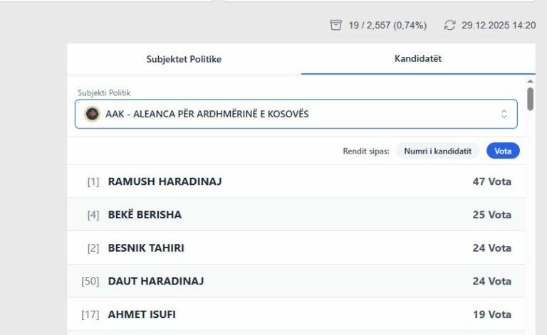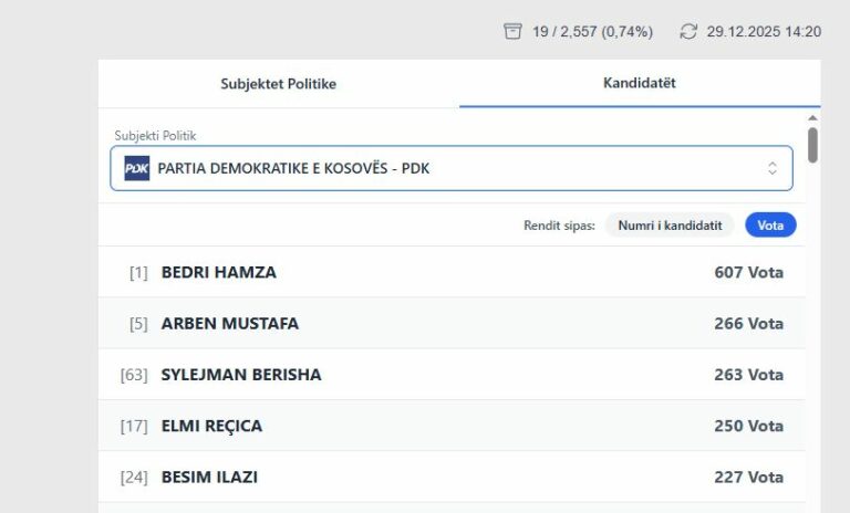 Deri në këto momente, sipas rezultateve të përditësuara nga KQZ, kandidatët nga Lëvizja Vetëvendosje po prinë për nga numri i votave të marra.
