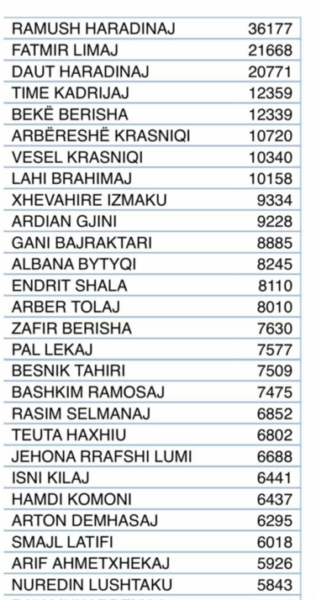 Në listën e fundit të përditësimit nga numëri i votave kreu i AAK-së Ramush Haradinaj ka marrë mbi 36 mijë vota, ndërsa Fatmir Limaj kryetar në partinë NISMA, ka marrë mbi 21 mijë vota.