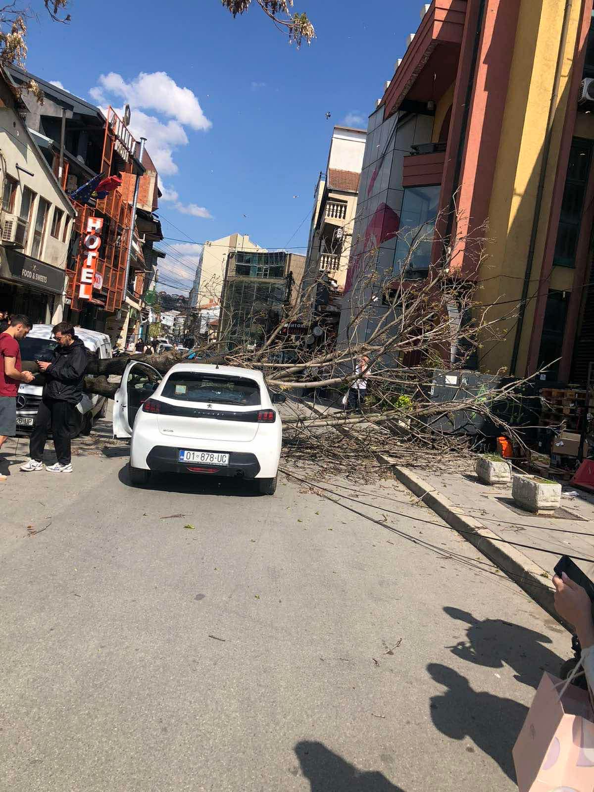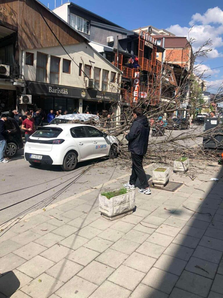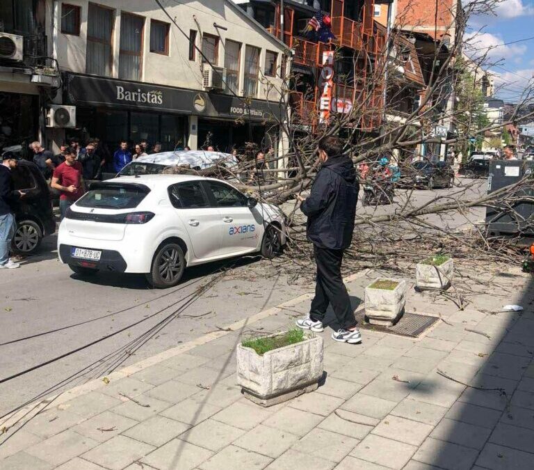Një veturë e parkuar është dëmtuar sot në rrugën “Bajram Kelmendi” në Prishtinë, pas rrëzimit të një lisi.