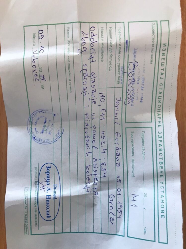 Një prej këtyre dokumenteve është vërtetimi i lëshuar nga Qendra e Mjekësisë në Vrbovac për qytetaren Gordana Jerinic, e datëlindjes 15.01.1954, në të cilin thuhet se “i lejohet votimi me ndihmën e asistentit për shkak të moshës dhe sëmundjeve të shoqëruara”.