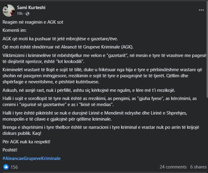 Duke komentuar reagimin e tyre, Kurteshi thotë se AGK që moti ka pushuar të jetë mbrojtëse e gazetarëve. Sipas tij, që moti është shndërruar në Aleancë të Grupeve Kriminale, raporton Paparaci.