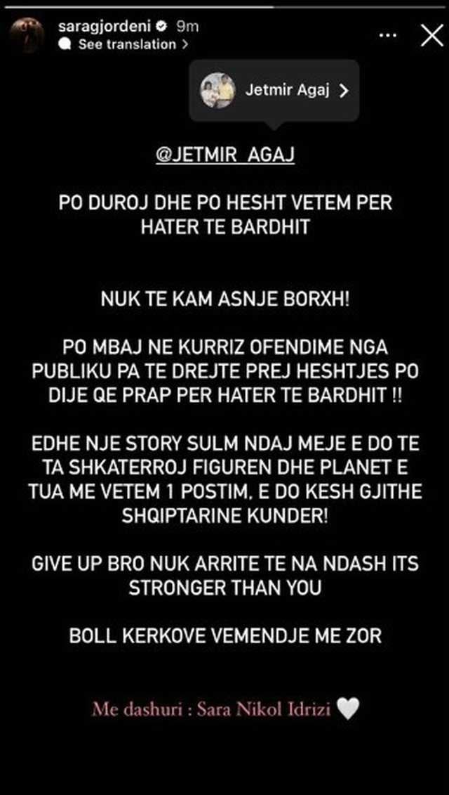 “Jetmir Agaj, po duroj dhe po hesht vetëm për hatër të Bardhit. Nuk të kam asnjë borxh. Po mbaj në kurriz ofendime nga publiku, pa të drejtë, prej heshtjes por dije prapë për hatër të Bardhit. Edhe një postim sulm ndaj meje, do të të shkatërroj figurën dhe planet e tua vetëm me një postim dhe do kesh të gjithë shqiptarët kundër. Dorëzohu, nuk arrite të na ndash, është me e fortë se ty. Boll kërkove vëmendje me zor”, shkruan Sara.