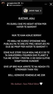 “Jetmir Agaj, po duroj dhe po hesht vetëm për hatër të Bardhit. Nuk të kam asnjë borxh. Po mbaj në kurriz ofendime nga publiku, pa të drejtë, prej heshtjes por dije prapë për hatër të Bardhit. Edhe një postim sulm ndaj meje, do të të shkatërroj figurën dhe planet e tua vetëm me një postim dhe do kesh të gjithë shqiptarët kundër. Dorëzohu, nuk arrite të na ndash, është me e fortë se ty. Boll kërkove vëmendje me zor”, shkruan Sara.