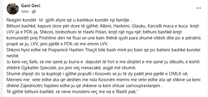 Përmes një postimi në Facebook, Geci i ka akuzuar këto dy pole politike se janë bërë bashkë kundër familjes së tij, duke i quajtur ato “pjellë të njëra-tjetrës”.