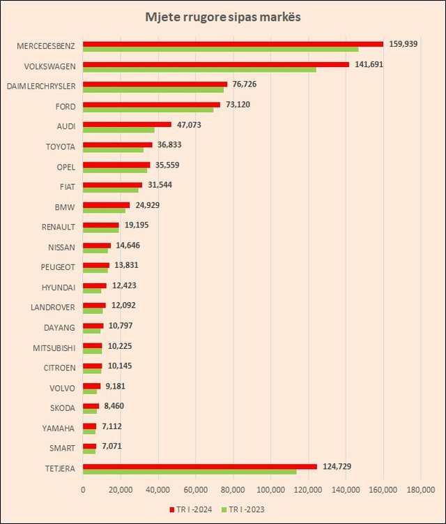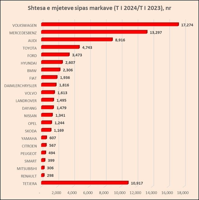 Diferenca mes tyre në raport me totalin e mjeteve është ngushtuar me gati 1 pikë përqindje në një vit. Nga 78 mijë automjete që u shtua në një vit, 17 mijë ishin të markës “Volkswagen”, 13 mijë ishin “Mercedez Benz”, gati 9 mijë Audi, 4.7 mijë Toyota, 3.4 mijë Ford.