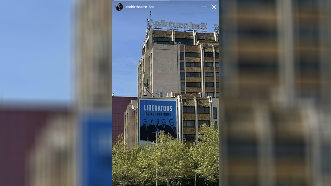 Endrit Thaçi, djali i ish-presidentit të Kosovës, Hashim Thaçi ka shpërndarë në Instagram një fotografi të një baneri të vendosur në kryeqytet në mbështetje të çlirimtarëve.