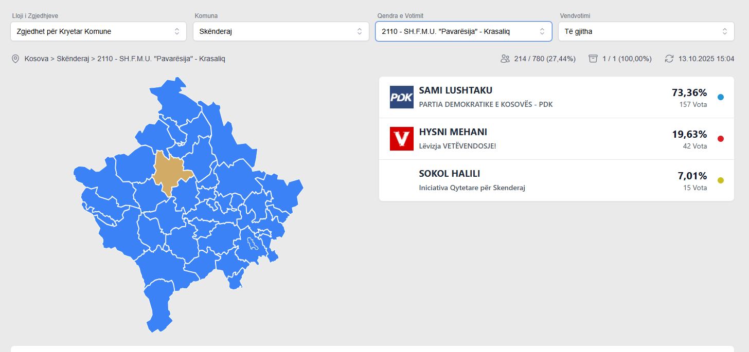 Komuna e Skënderajt u fitua me të parën nga Lushtaku i PDK-së me 83,45% në zgjedhjet lokale të 12 tetorit.
