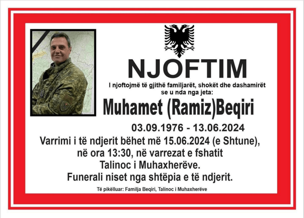 Nënoficeri i Forcës së Sigurisë së Kosovës, Muhamet Beqiri, sot do të varroset në fshatin e tij të lindjes, në Talinoc i Muhaxherëve të Ferizajt.