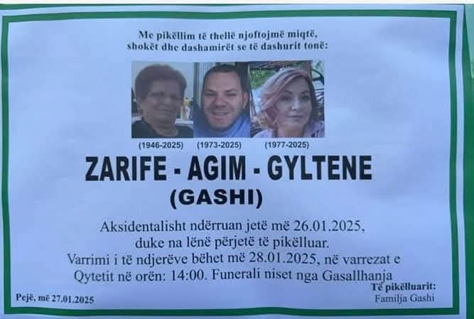 Nga një aksident i rëndë trafiku humbën jetën tre anëtarë të familjes Gashi nga Peja.