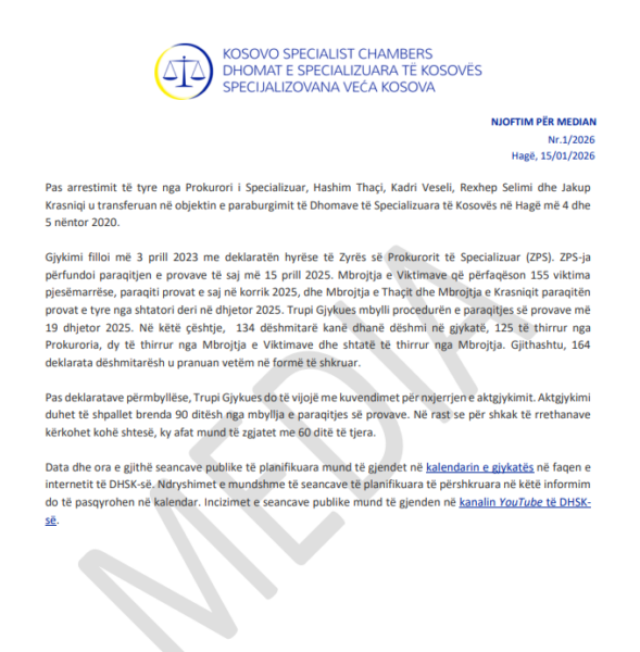 Gjykata Speciale në Hagë ka publikuar një njoftim lidhur me procesin gjyqësor ndaj Hashim Thaçit, Kadri Veselit, Rexhep Selimit dhe Jakup Krasniqit.