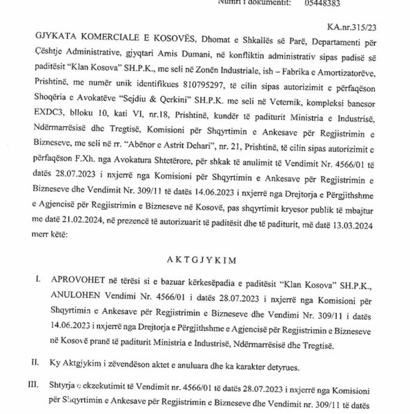 Sipas aktgjykimit të datës 13.03.2024, i nxjerrë nga gjyqtari Arnis Dumani, vendimi për shtyerjen e ekzekutimit të vendimit të marrë nga Drejtorja e Përgjithshme e Agjencisë për Regjistrimin e Bizneseve në Kosovë, do të mbetet në fuqi deri në plotfuqishmërinë e aktgjykimit.