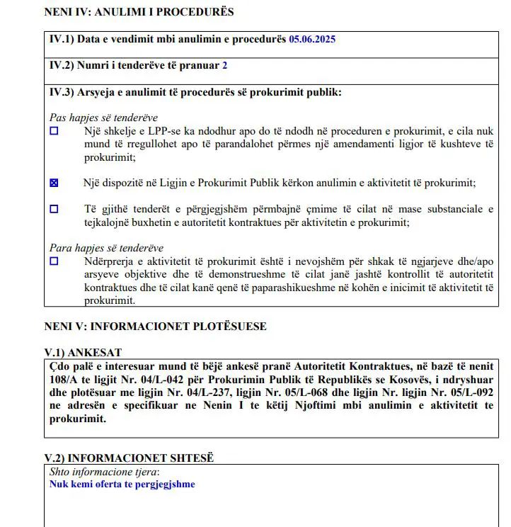 Sipas njoftimit të publikuar në platformën zyrtare të prokurimit elektronik – E-prokurimi, për këtë aktivitet kanë aplikuar dy operatorë ekonomikë, por të dy janë shpallur të papërshtatshëm për të vazhduar më tej në procedurën e prokurimit.