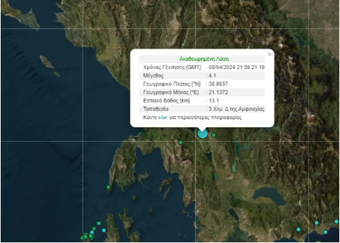 Epiqendra e tërmetit, është regjistruar në një distancë prej 3 kilometrash në perëndim të Amfilochisë, ose 246 kilometra nga Athina.
