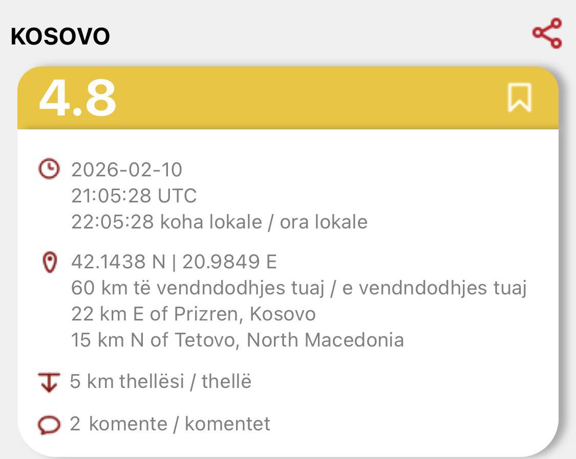 Sipas të dhënave të regjistrimit të tërmeteve, epiqendra ishte në Shtërpcë të Ferizajt.
