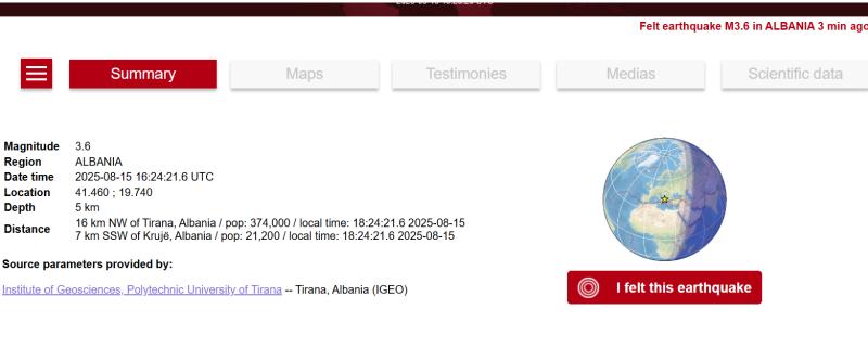 Lajme Tërmet në Shqipëri 📅 15 August 2025 🕐 15.08.2025 👁 0 shikime 4 Lëkundje të lehta tërmeti janë ndjerë pasiten e sotme në Tiranë. Sipas EMCS epiqendra e tërmetit eshte shenuar në Nikël të Fushë Krujës, rreth 16 kilometra nga Tirana. Magnituda ka qenë 3.6 ballë, ndërsa thellësia 4 kilometra. Shqipëritermet f 𝕏 W T