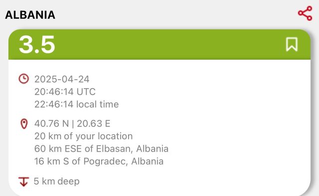 Lajme Tërmet në Shqipëri, ja sa ishte magnituda 📅 24 April 2025 🕐 24.04.2025 👁 0 shikime 1 Lëkundje tërmeti janë ndjerë sonte në Shqipëri. Tërmeti i regjistruar është me magnitudë 3.5 ballë. Sipas tabelës që shihni më poshtë, tërmeti ndodhi në Elbasan ndërkohë lëkundjet janë ndjerë edhe në Pogradec. ShqipëriTermeti f 𝕏 W T