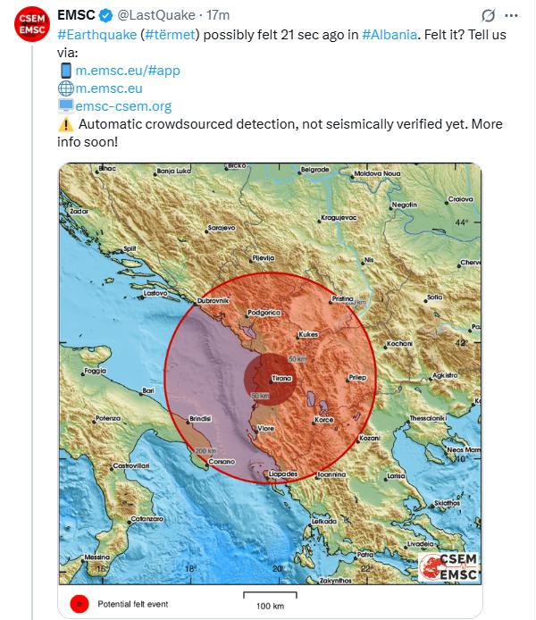 Sipas të dhënave nga Qendra Sizmologjike Euro-Mesdhetare (EMSC), tërmeti ka pasur epiqendrën rreth 9 kilometra në veri-perëndim të Tiranës.
