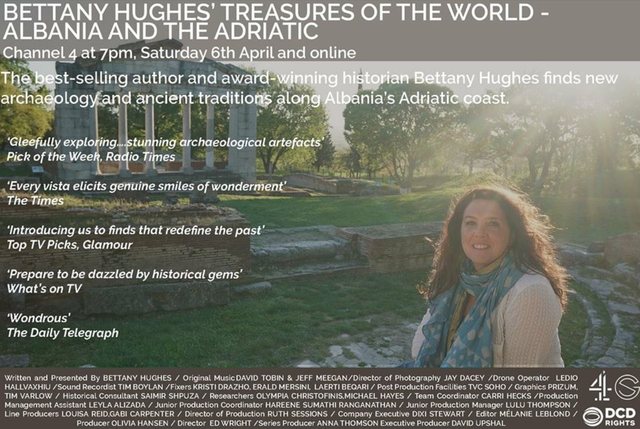 “Lajm i mrekullueshëm! Seria e re e “Thesareve të Botës” e Bettany Hughes rikthehet në Channel 4, në Mbretërinë e Bashkuar, me episodin e parë mbi mrekullitë e Shqipërisë dhe Adriatikut, të shtunën më 6 prill.