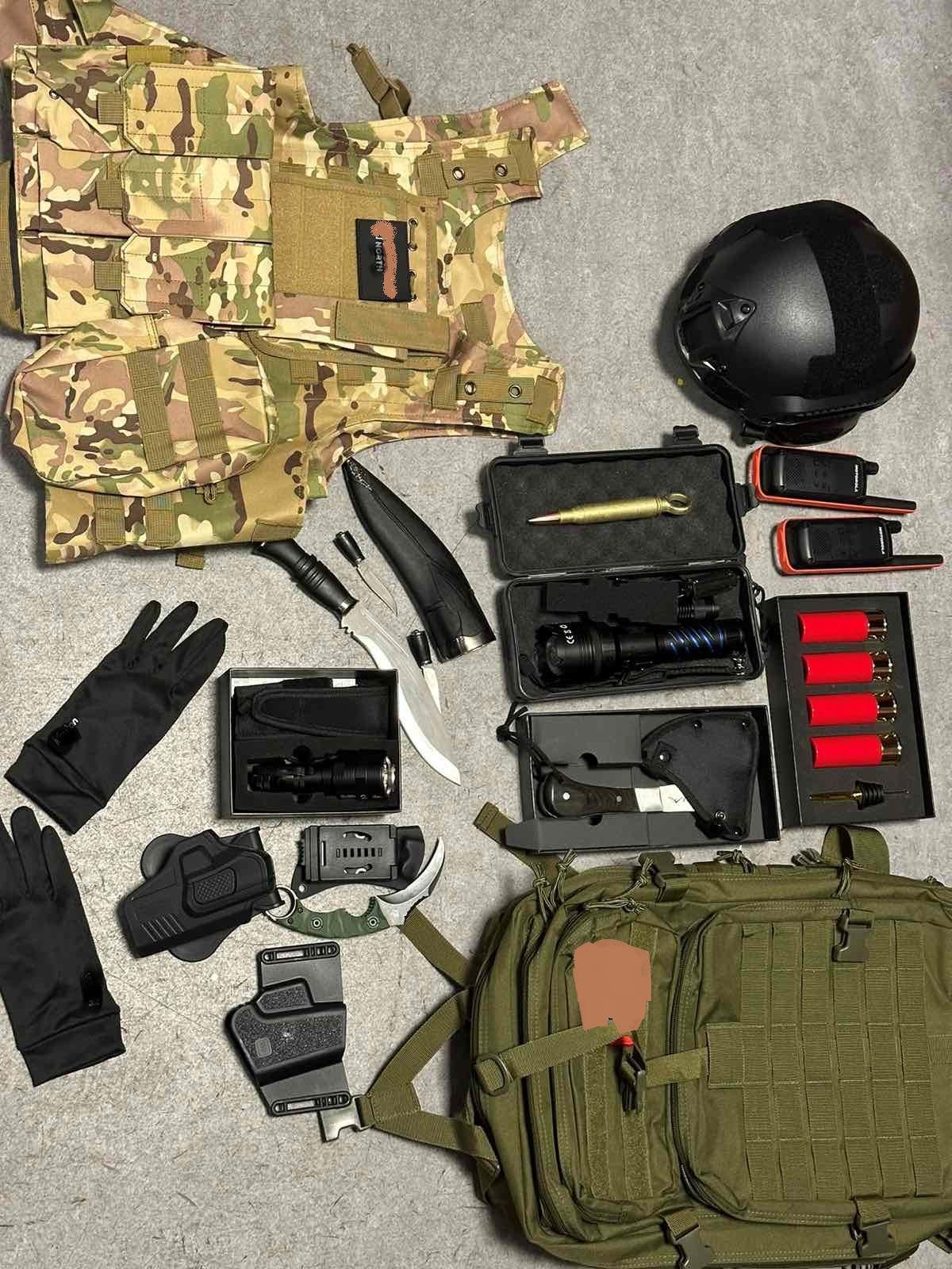 “Tri thika luftarake, dy radiolidhje-motorola, një çantë ushtarake, një jelek taktik, një palë doreza, një helmetë taktike, tri bateria, dy këllëf për revole, një imtim i predhës, etj”, thuhet në njoftim e Policisë, ku theksohet se rasti është iniciuar si “import , eksport, furnizim, prodhim, këmbim, ndërmjetësim ose shitje e paautorizuara e armëve”.