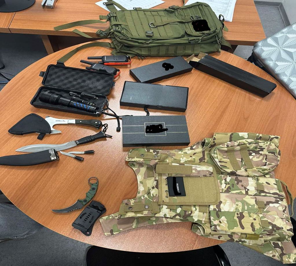 “Në këtë fushëveprim sot me datë 24.12.2023, rreth orës 10:00, në hyrje të Republikës së Kosovës në Merdar gjatë kontrollimit në bagazhin e një autobusi me targa të huaja, respektivisht kontrollimit me skaner të valixheve, në valixhen e një pasagjeri autoritete kufitare (policore dhe doganore) kanë hasur në disa pajisje të dyshuara ushtarake: tri (3) thika luftarake, dy (2) radiolidhje-motorola, një (1) çantë ushtarake, një (1) jelek taktik, një (1) palë doreza, një (1) helmetë taktike, tri (3) bateria, dy (2) këllëf për revole, një (1) imtim i predhës, etj”, thuhet në njoftim.